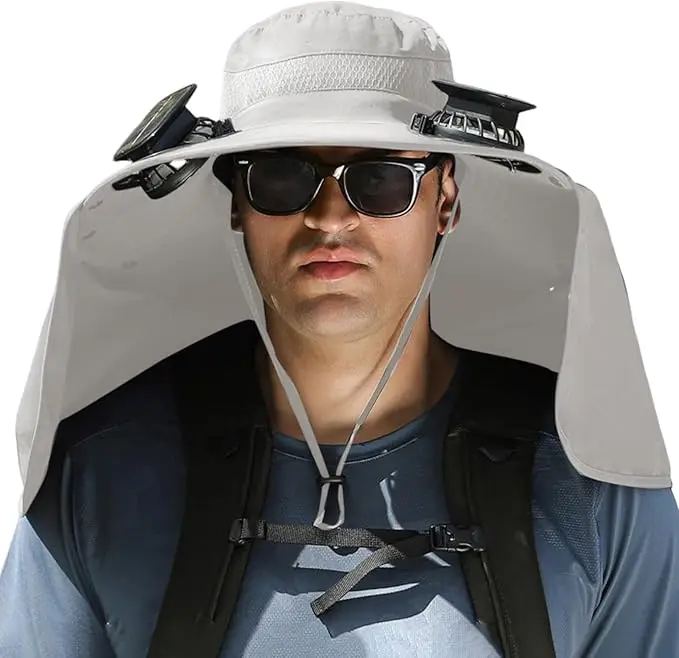 【Upgraded Dual Fans + Wide Brim Outdoor Fishing Hat】Solar powered fan hat, air intake from both sides, doubling the heat dissipation capacity. The wide brim solar fan outdoor fishing hat 19"/48cm wide brim creates a large sunshade area, effectively covering the face and neck from direct sunlight, feel cool even outside.