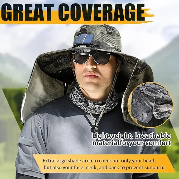 【Super Sun Protection---Fishing Hat With Fans】Solar fan hat, large area shielding + fabric upf50+, blocks direct sunlight, upf50+ protection effectively blocks 98% of UV rays in outdoor tests, solar fan hats for men making outdoor work easy to complete!